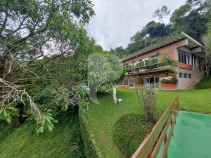 Excelente propriedade em condomínio classe AA e totalmente integrado à natureza . Terreno com 11.000 m² totalmente aproveitável; todo gramado com paisagismo e sistema de iluminação; com riacho e 2 piscinas naturais; campo de futebol; quadra de tênis de saibro; Anexo com churrasqueira, pia, ducha e banheiro; Ampla suíte de hóspede com varanda , closet, sala íntima e sauna à vapor com banheiro integrado. Casa de boneca com instalações hidráulicas. Piscina com borda infinita com vista para montanha. Amplo espaço gourmet com sala em três ambientes com lareira, bar e cozinha, adega climatizada e lavabo; Nível inferior com SPA com sauna seca, ducha, sala de repouso e hidro.